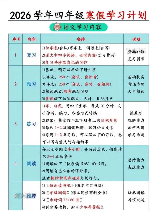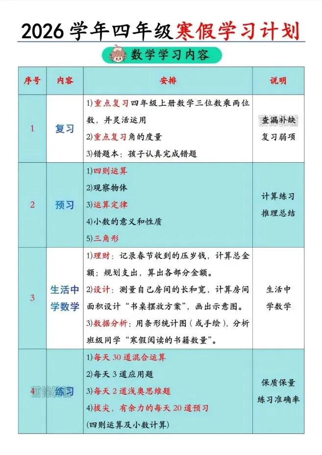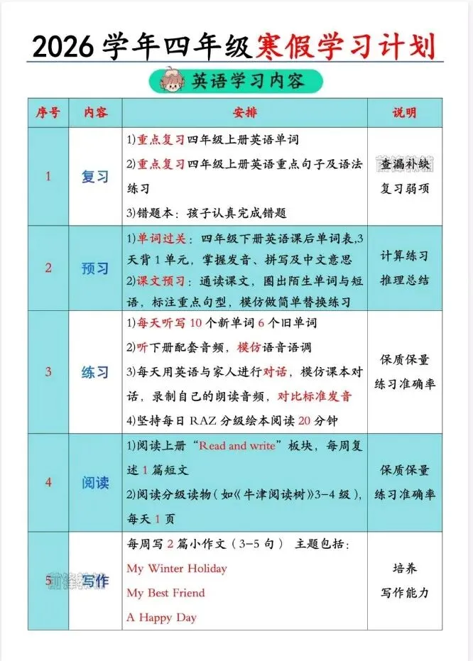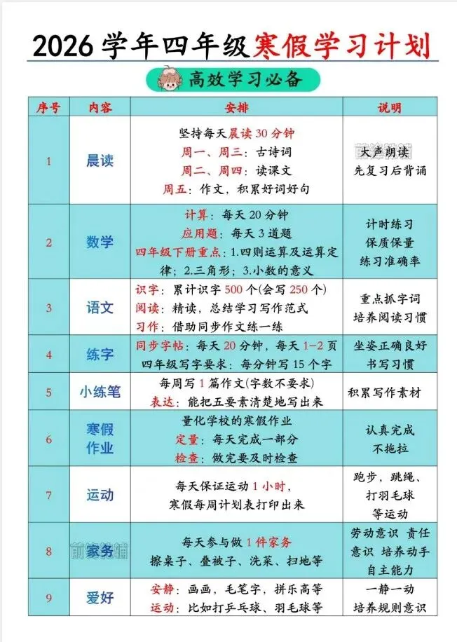 今天给大家整理了26四年级寒假学习计划,转发给朋友或班级群,受益更多人,帮助孩子学习!