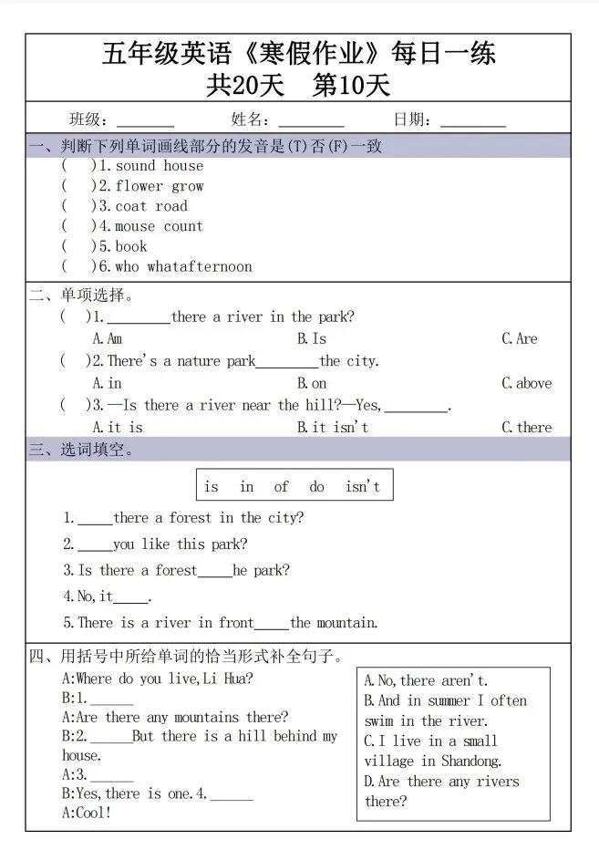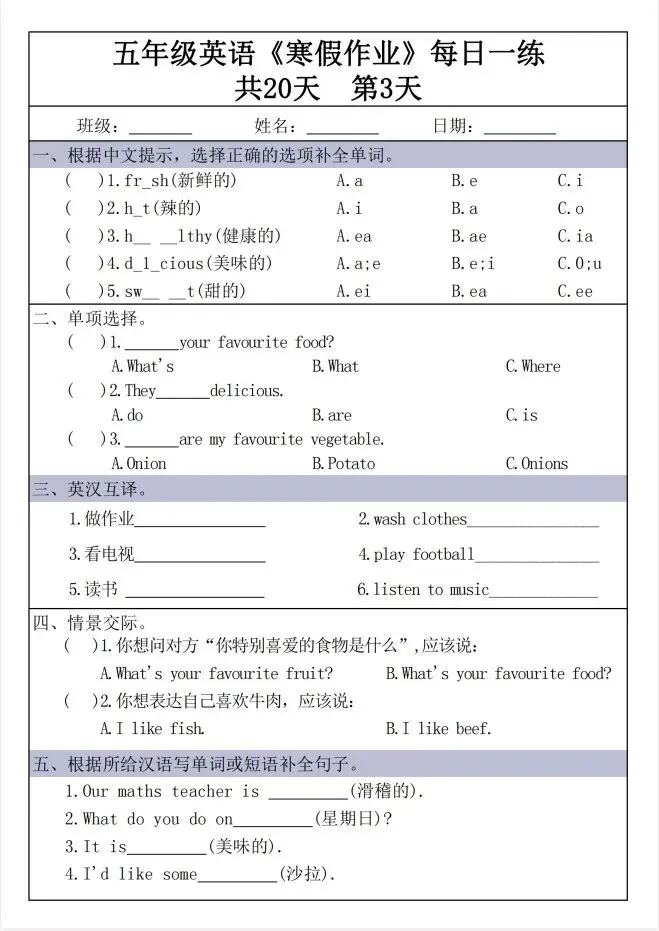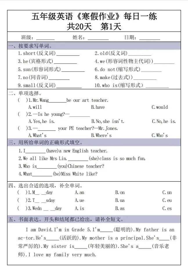 今天给大家整理了新五年级英语寒假作业每日一练30天30页,转发给朋友或班级群,受益更多人,帮助孩子学习!