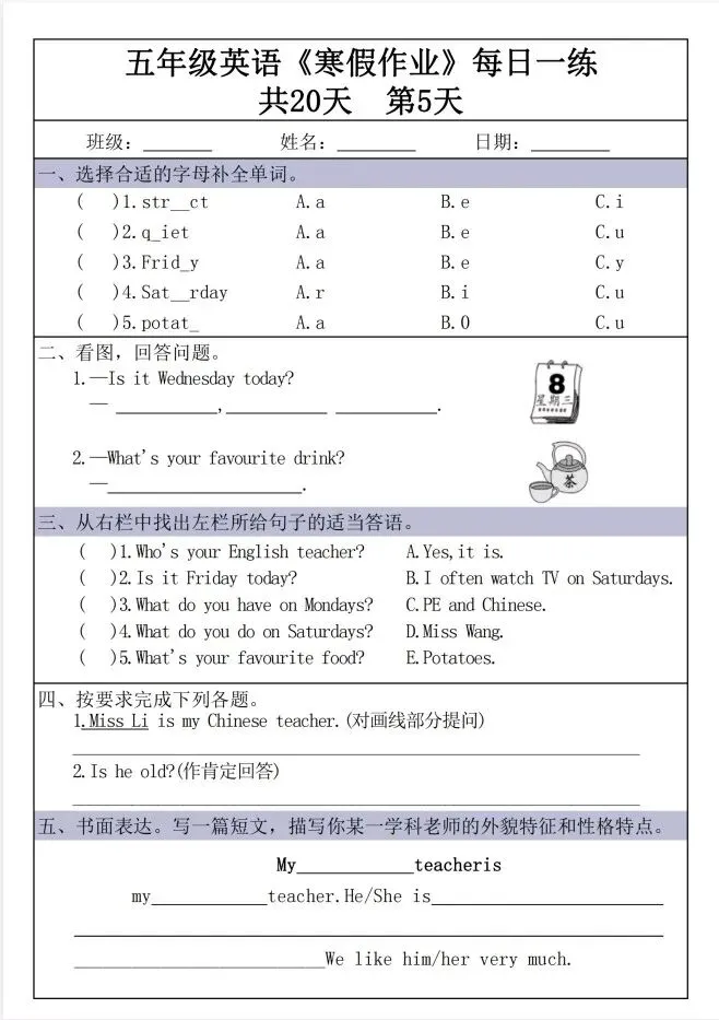 文末免费下载|新五年级英语寒假作业每日一练30天30页