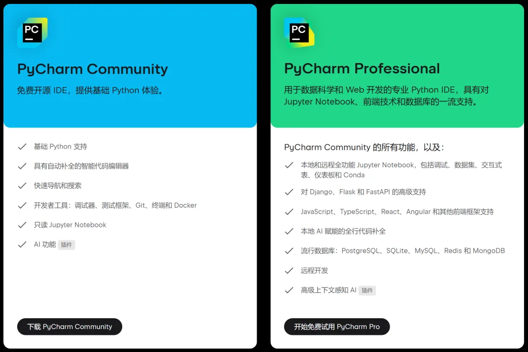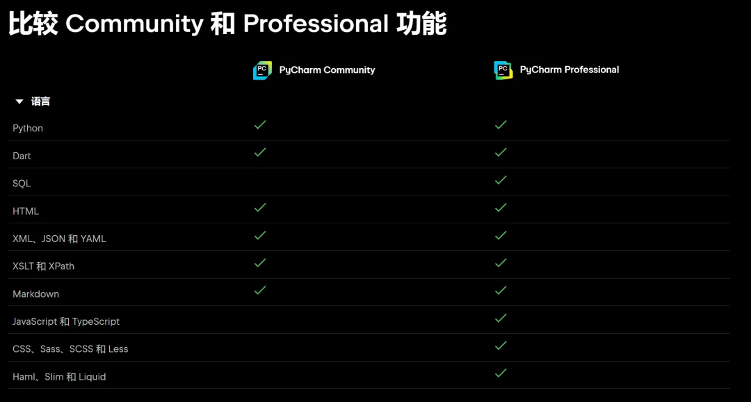 PyCharm有两个版本可供下载,分别是Community(免费版)和Professional(收费版),两者的大致差别可查看下图。