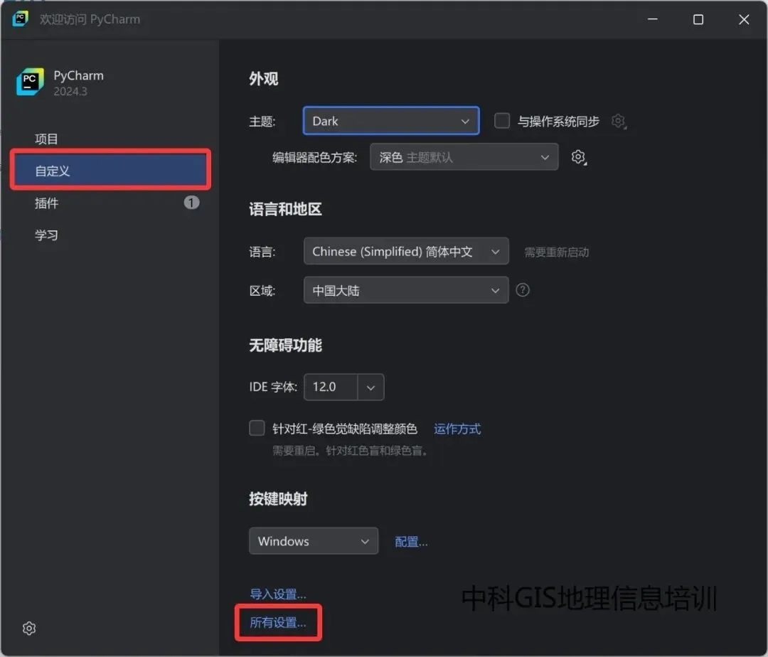 1.打开PyCharm,选择自定义——所有设置。
