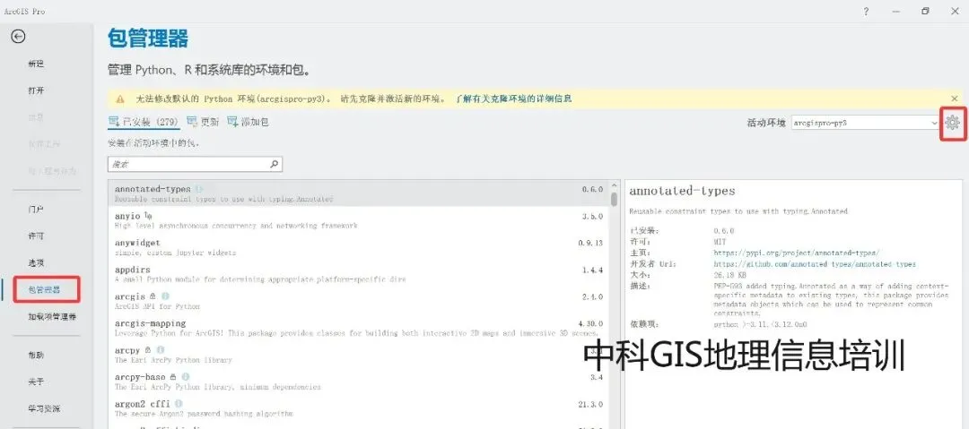 2.单击设置——包管理器,找到环境管理器。