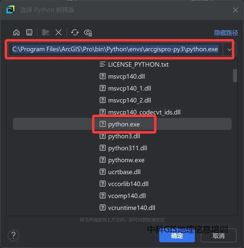 安装 ArcGIS Pro 时,将创建一个 Python 环境,并将其与 ArcGIS Pro 程序文件一起放置。要为项目设置 Python 解释器,首先需要找到存储 Python 解释器的文件路径。