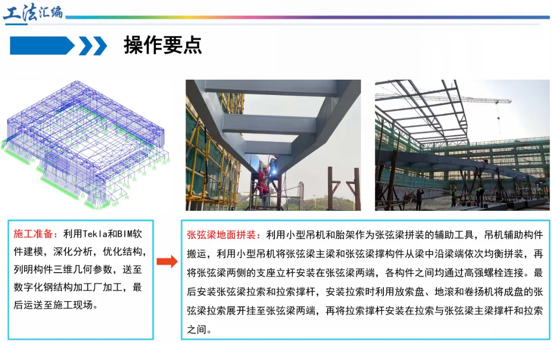 大跨度屋盖有妙招: “大跨度张弦梁与桁架悬挑组合屋架施工工法”巧妙结合两种结构优势,不仅节省15%成本,更大幅提升空间利用率,已在亚运手球馆成功应用。