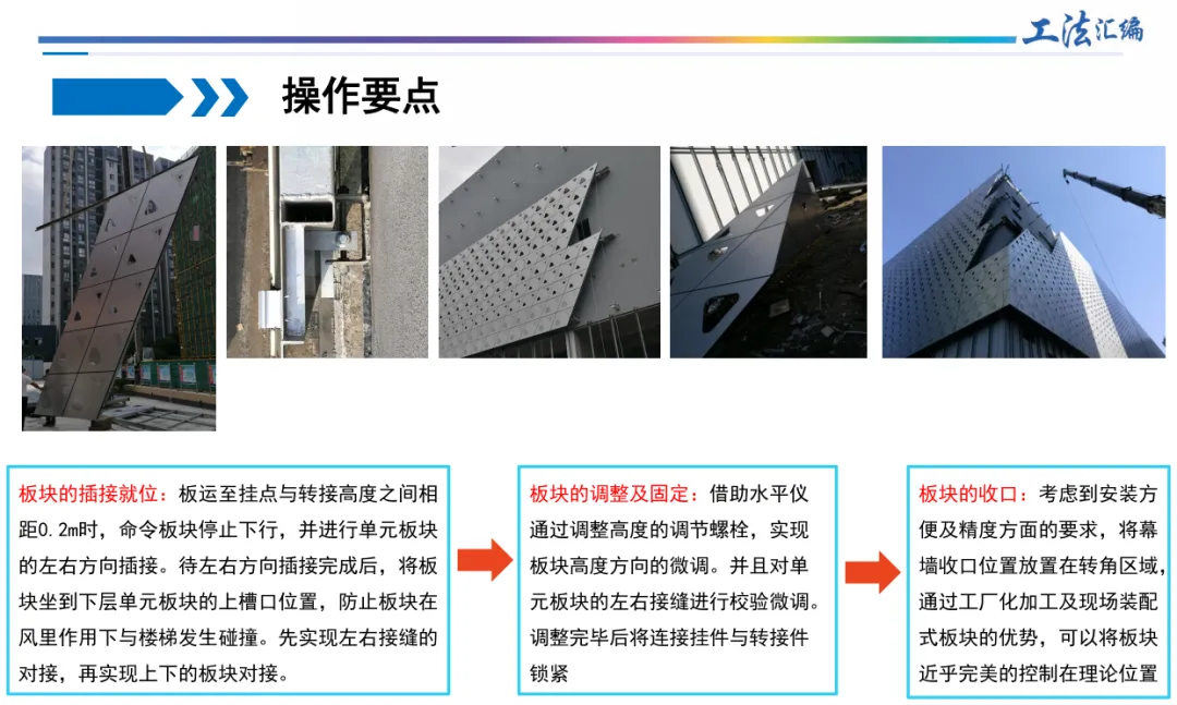 告别漏浆烦恼、细节处理更巧妙: “叠合板接缝防漏浆施工工法”和“叠合板与大截面框架梁组合施工工法”通过T型加固件、双面胶、独立支撑等精细化措施,让板底接缝平整如镜,观感质量大幅提升。从PC楼梯纵向拼缝的刚柔结合灌浆,到窗台板采用U型预制构件,再到外立面线条后置安装,每一项工法都体现了对施工细节的极致追求。