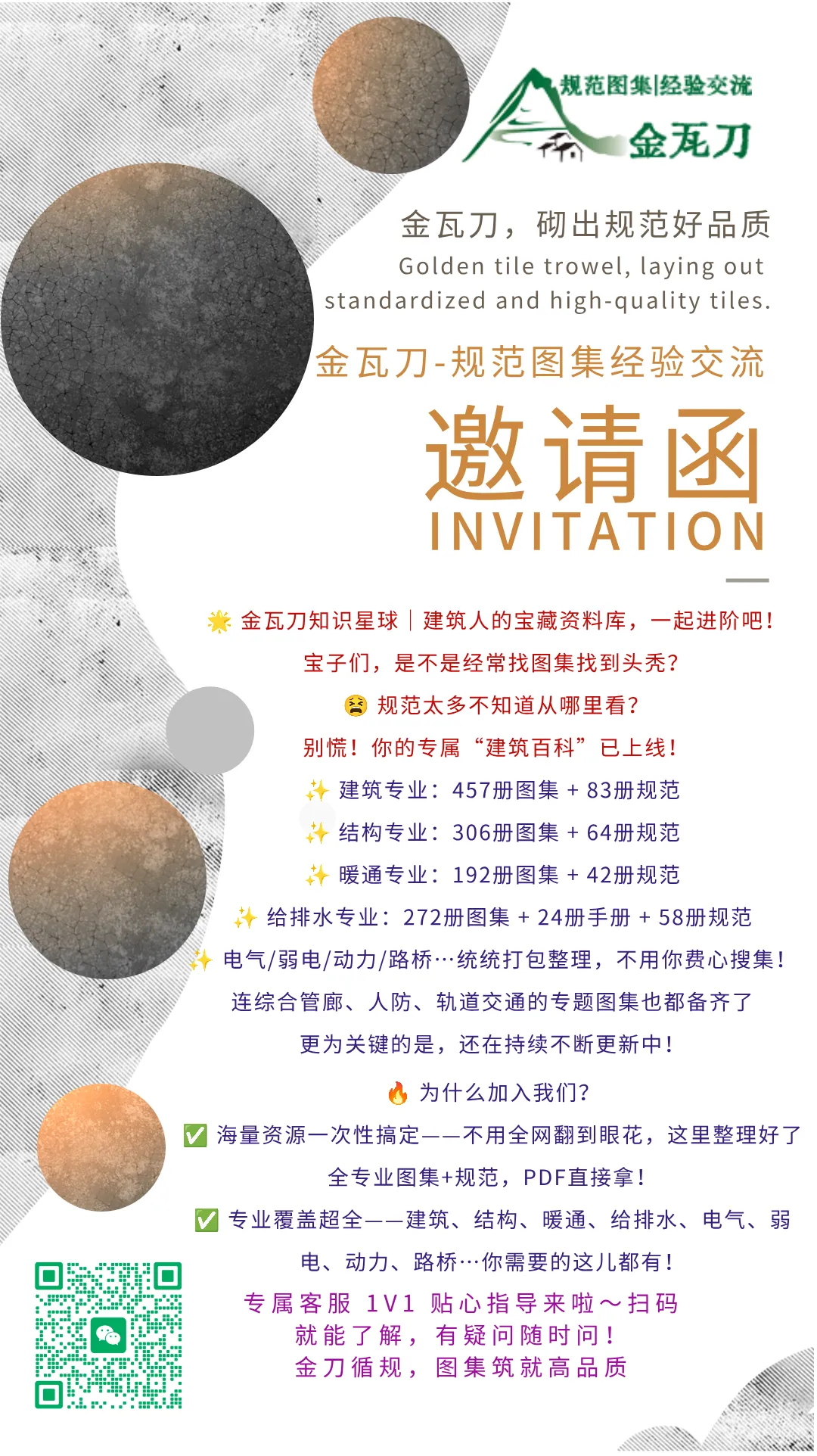 您是否还在为找图集、翻规范彻夜难眠?加入「金瓦刀」,1000+册图集、10000+册规范已为您备好,而且持续不断的更新中!这里不止是资料库,更是建筑人的精神家园——经验共享、难题共解、尊严共建。扫码进群,从此施工不迷路,成长不孤单!金瓦刀,砌出规范好品质。而我们,一起,把建筑这件事,做得更有尊严。扫码进群,不只是获取资料,更是走进一个属于建筑人的温暖AI智能体。