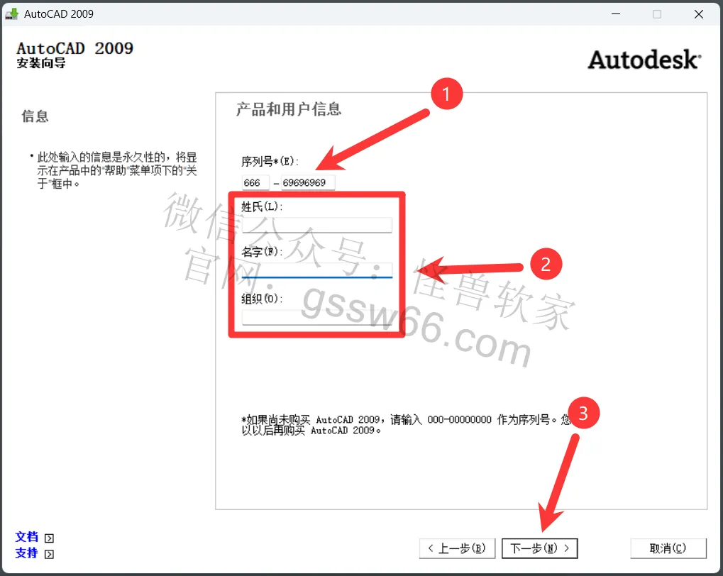 14,输入序列号“666-69696969”,用户信息随便输入,点击“下一步”