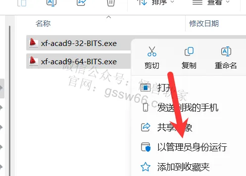 25,找到并选中“xf-acad9.exe”程序(64位系统运行64-bits,32位系统运行32-bits),点击鼠标右键,点击“以管理员身份运行”