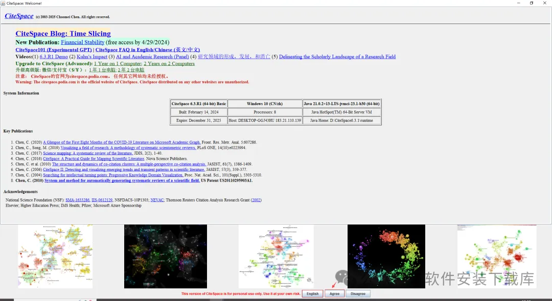 | 1.找到下载好的CiteSpace安装包,解压安装包:①鼠标右击【CiteSpace6.3.1】压缩包②选择"解压到当前文件夹"2打开解压出来的文件夹,找到"Setup"文件夹然后双击打开4.修改路径地址中的第一个字符C可更改安装位置(如:把C改为D软件将安装到D盘),点击【Next】6.安装中...7.点击【Finish】。8.双击桌面【CiteSpace】图标启动软件。9.点击【English】显示为中文时,点击【Agree】。10.安装成功! |