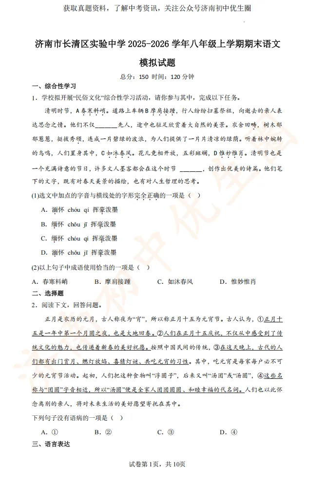 临近期末,优生圈整理长清实验中学初二模拟试题,获取完整版试题,可以扫描下方二维码领取。25-26学年期末试题将持续更新