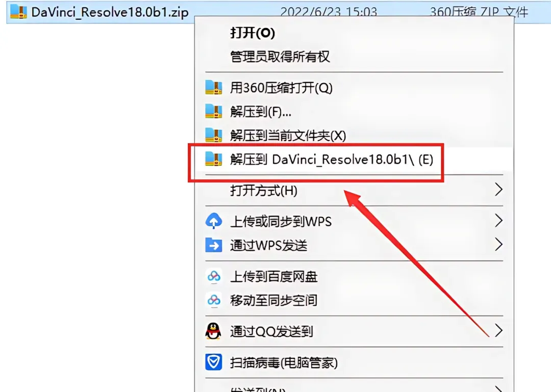 1.打开下载的达芬奇18安装包,鼠标右击压缩包选择【解压到DaVinci--18---】。
