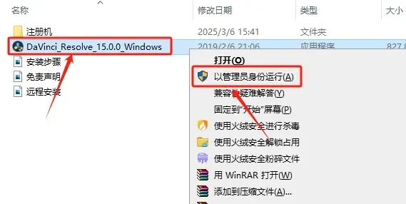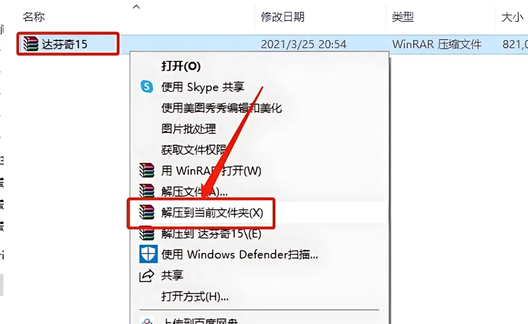 1.打开下载的达芬奇15安装包,鼠标右击压缩包选择【解压到当前文件夹】。