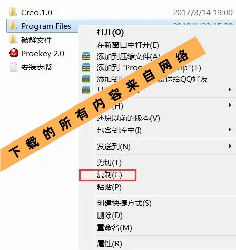 2.在解压后的文件夹中,找到并右键单击 “Program Files” 文件夹,选择 “复制”。