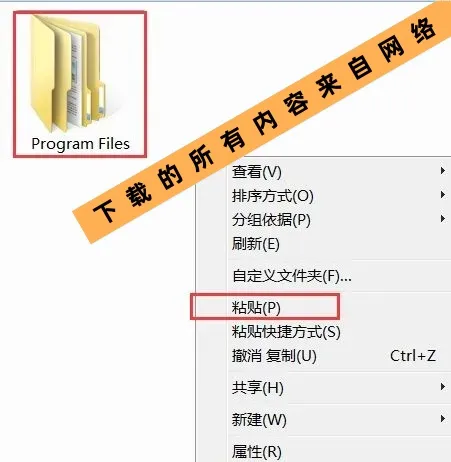 3.将“Program Files”粘贴到除C盘以外的其他盘,可在D盘或其它盘空白处鼠标右击选择粘贴。本教程以D盘为例做讲解。