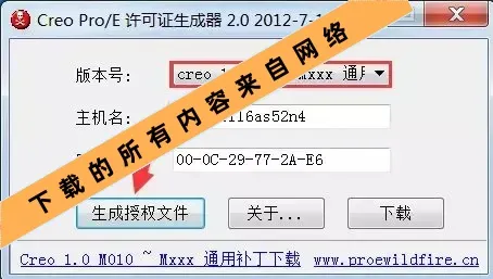 8.选择“creo 1.0 M010~Mxxx 通用”后,点击“生成授权文件”。