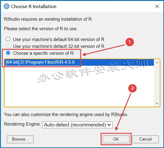 19.选择【Choose a specific version of R】和【...R-4.5.0】,最后点击【OK】
