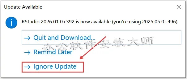 20.打开可能会有以下更新弹窗,直接点击【Ignore Update】取消即可。