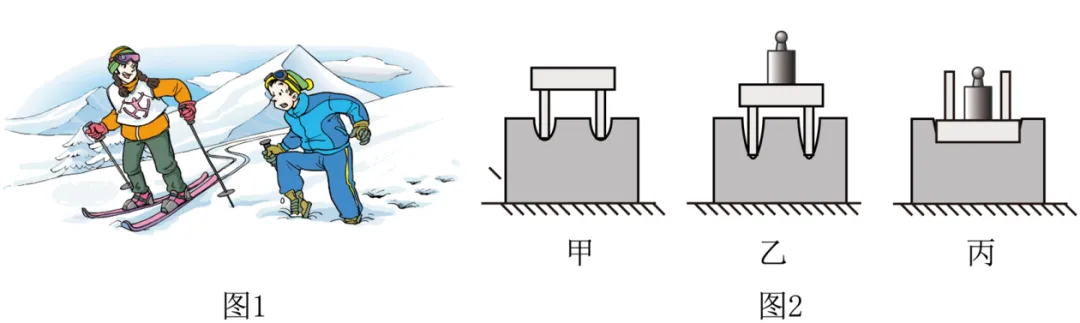 11. 如图1,表示体重大致相同的滑雪者和步行者在雪地里行走的情景,此情景说明压力相同时,受力面积越______压力的作用效果越明显;现利用海绵、小桌、砝码探究压力的作用效果与压力的关系,应选择图2中的______两图。