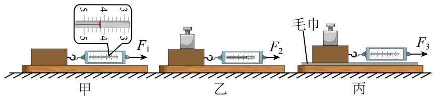 (3)在进行图丙的实验时,小明发现当弹簧测力计示数达到最大值时仍没拉动木块。为了使用现有实验器材顺利完成此探究,你可建议小明采取______的办法,测出滑动摩擦力的大小,再和图中______(填“甲”或“乙”)进行比较,来完成探究滑动摩擦力与接触面粗糙程度的关系实验。