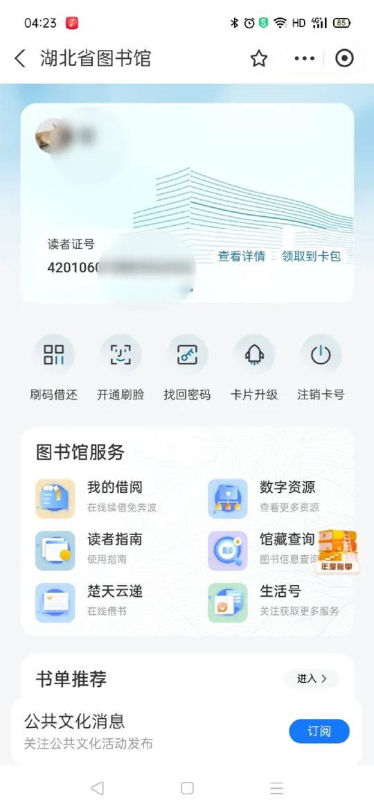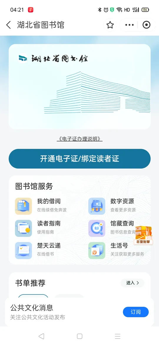 点击进入,只要你的芝麻信用分≥650,即可开通湖北省图书馆的电子证,使用湖北省图书馆的各项服务。
