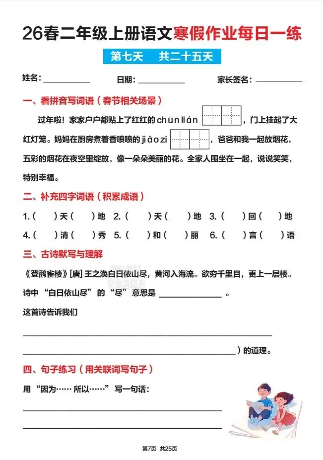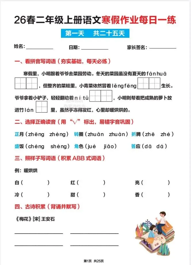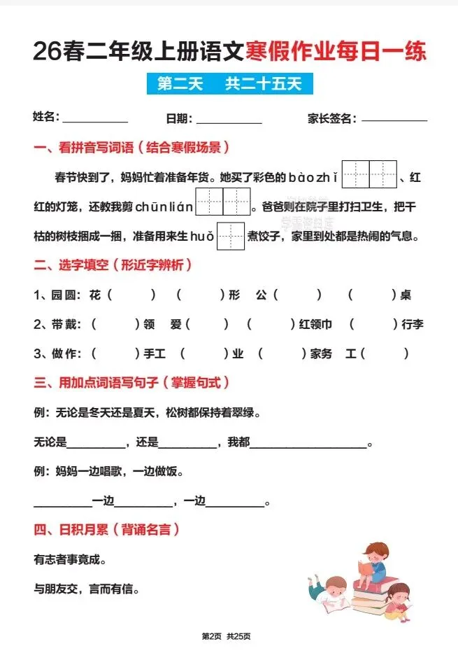 文末免费下载|26春新二年级上册语文寒假作业25天