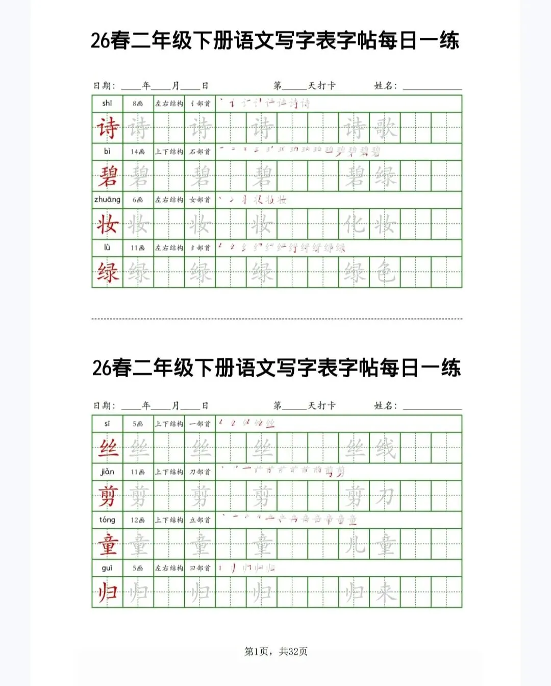今天给大家整理了26春二下语文写字表字帖每日一练32页,转发给朋友或班级群,受益更多人,帮助孩子学习!