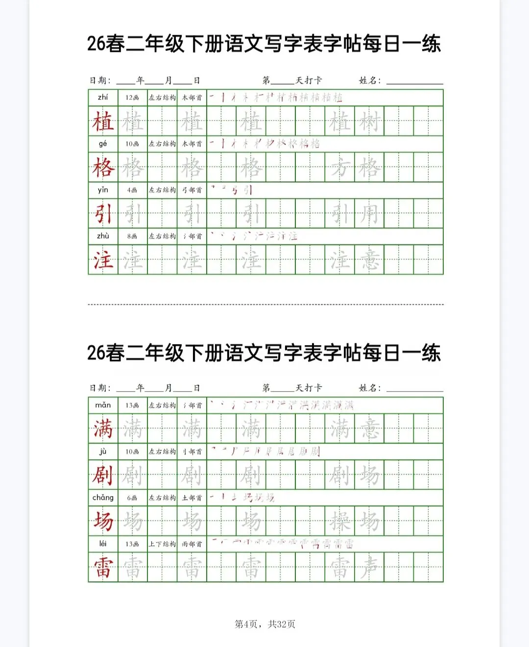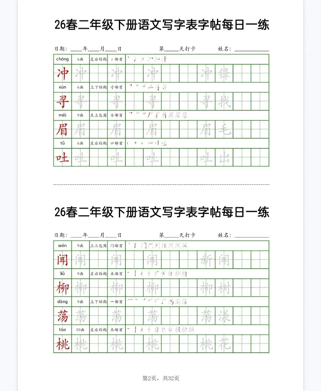 文末免费下载|26春二下语文写字表字帖每日一练32页