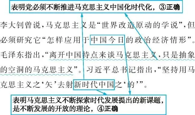 1.李大钊曾说,马克思主义是“世界改造原动的学说”,但必须研究它“怎样应用于中国今日的政治经济情形”。毛泽东指出,“离开中国特点来谈马克思主义,只是抽象的空洞的马克思主义”。习近平总书记指出,“坚持用马克思主义之‘矢’去射新时代中国之‘的’”。这些论述强调