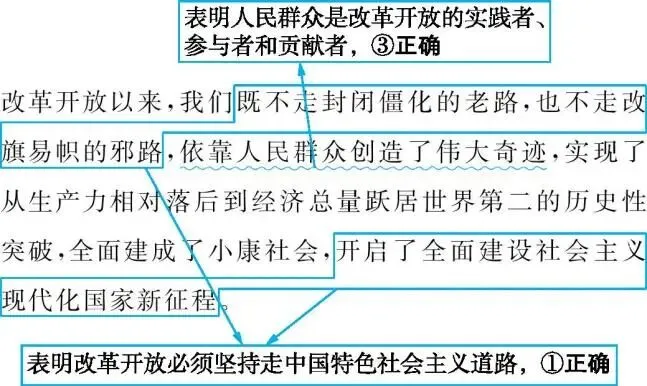 改革开放要突破旧的体制机制的约束,解放和发展生产力,②错误。改革开放以来,我国取得一切成绩和进步的根本原因,归结起来就是:中国共产党带领全国人民,开辟了中国特色社会主义道路,形成了中国特色社会主义理论体系,确立了中国特色社会主义制度,发展了中国特色社会主义文化,④观点错误。