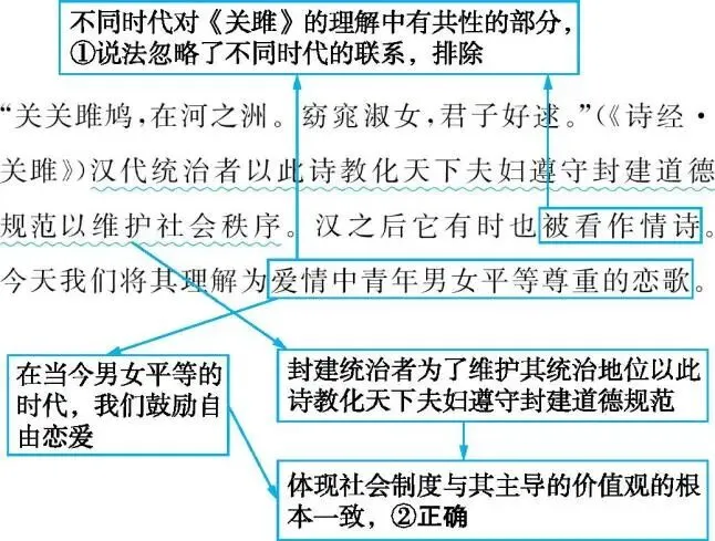 11.“关关雎鸠,在河之洲。窈窕淑女,君子好逑。”(《诗经·关雎》)汉代统治者以此诗教化天下夫妇遵守封建道德规范以维护社会秩序。汉之后它有时也被看作情诗。今天我们将其理解为爱情中青年男女平等尊重的恋歌。对《关雎》的不同理解