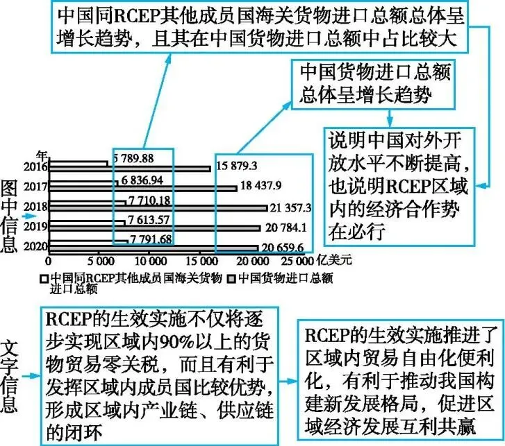 17.(1)①2016—2020年,中国货物进口总额总体呈增长趋势,中国同RCEP其他成员国海关货物进口总额也呈增长趋势,且中国同RCEP其他成员国海关货物进口总额在中国货物进口总额中占比较大,说明中国对外开放水平不断提高,也说明RCEP区域内的经济合作势在必行。②《区域全面经济伙伴关系协定》在中国正式生效实施,推进了区域内贸易自由化便利化,有利于推动我国构建新发展格局,促进区域经济发展互利共赢。