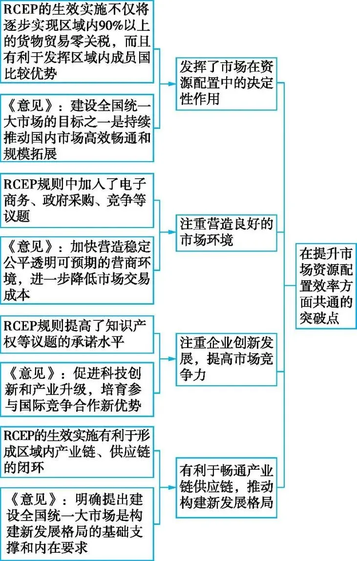第二步,梳理思路。对比分析材料一和材料二,运用相关知识分析RCEP的生效实施与建设全国统一大市场在提升市场资源配置效率方面的共通之处,具体思路如下: