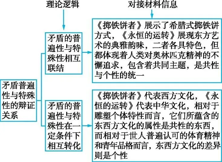 20.(1)①矛盾的共性和个性相互联结。一方面,共性寓于个性之中,并通过个性表现出来;另一方面,个性离不开共性,个性中总是包含着共性。《掷铁饼者》《永恒的运转》各具特色,个性鲜明,但包含着同一主题:生生不息的体育精神和敢于争先的青年品格。②矛盾的共性和个性在一定条件下相互转化。在一定场合为共性的东西,在另一场合则是个性;反之亦然。《掷铁饼者》代表西方文化,《永恒的运转》代表中华文化。相对于雕塑个体特性而言,它们所蕴含的东西方文化的属性是共性的东西;而相对于世人普遍认可的体育精神和青年品格而言,东西方文化的差异则是个性。