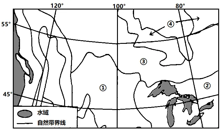 下图为北美洲局部地区陆地自然带分布图。完成下面小题。