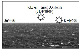 摄影爱好者在南半球某地朝西北固定方向拍摄太阳照片,拍摄时间为K日及其前、后第8天的同一时刻。图左为合成后的照片,图右为地球公转轨道示意图。完成下面小题。