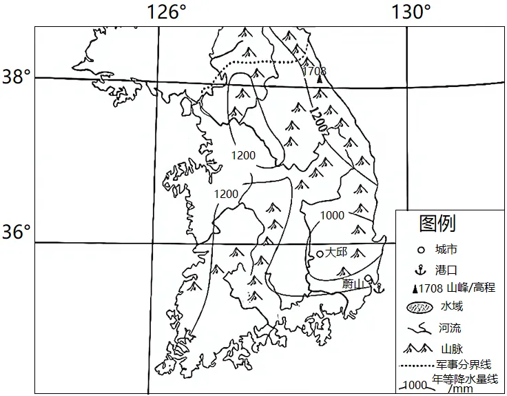 材料一:为应对全球变暖,一些国家和地区将对进口工业品征收碳关税(对生产过程中的碳排放征收相应的关税)。2019年,韩国非化石能源生产量占比为31.1%,能源发展重点为风能、太阳能等。下图为朝鲜半岛部分地区略图。
