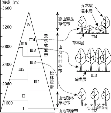 下图为“我国某山地垂直带谱及云杉林亚带的植被垂直分层示意图”。据此完成下面小题。