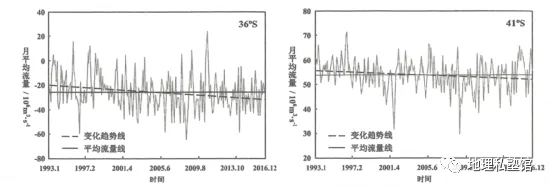 西风漂流绕过南美大陆南端后部分向北形成北上寒流,与巴西暖流交汇后东流。下图为“1993-2016年西南大西洋海区36°S和41°S附近两个截面逐月洋流流量及变化趋势图”(数值表示流量大小;正负表示流向,北向为正,南向为负)。据此完成下面小题。