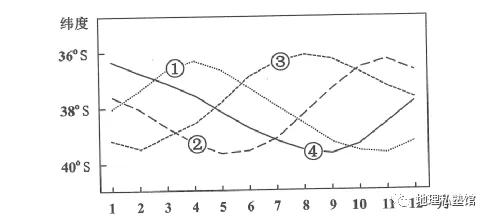 10. 下图中反映北上寒流和巴西暖流交汇处纬度位置年内变化的曲线是( )