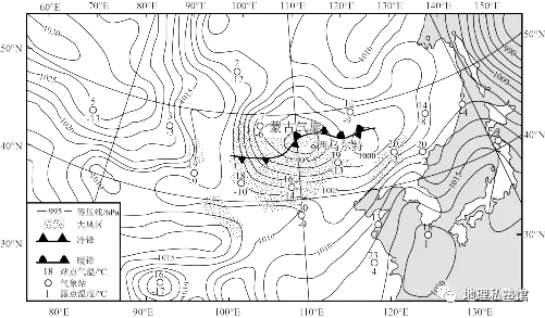 蒙古气旋是发源于蒙古国的温带气旋。下图为“某年4月9日某时刻亚洲局部地区海平面天气图”。据此完成下面小题。