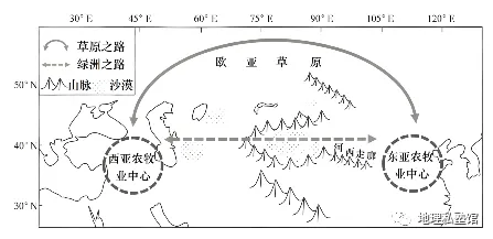 考古研究发现,从距今6000年到距今2200多年,欧亚大陆东西方交流和农收业扩散先后形成了“草原之路”和“绿洲之路”两个主要通道。下图为“欧亚大陆农牧业扩散路径示意图”。据此完成下面小题。