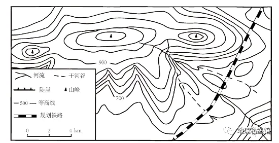 23. 某地规划的铁路穿过一冲积扇。下图为“某地地形及规划铁路位置示意图”。据此回答下列问题。