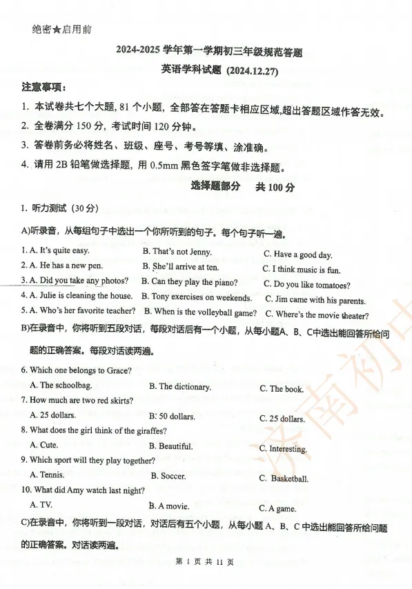 24-25学年东城逸家中学期末模拟试题