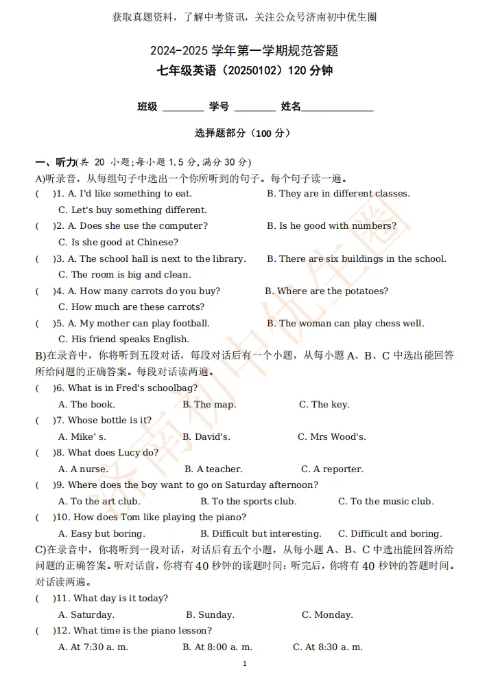临近期末,优生圈整理初一期末模拟试题,获取完整版试题,可以扫描下方二维码领取。25-26学年期末试题将持续更新