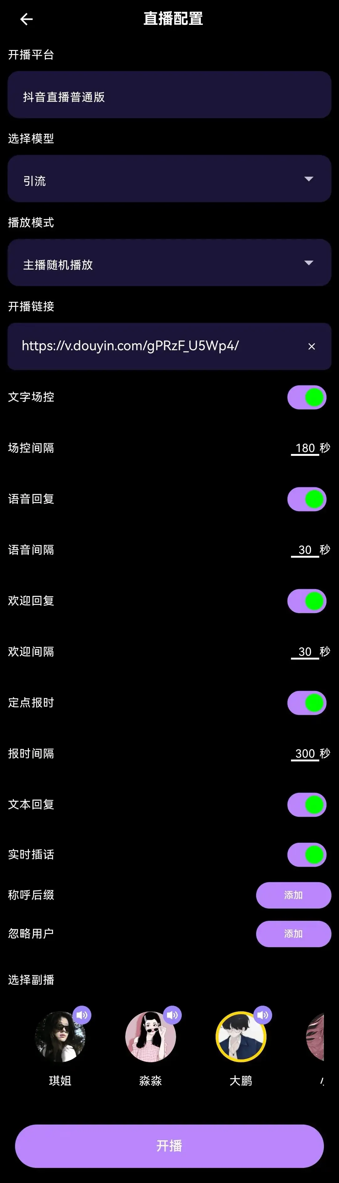 点击智能互动,智享AI直播三代有两种直播声音,分为主播和副播(你的直播助理),可以选择两个不同的声音模型,把主播的人设设定好好!