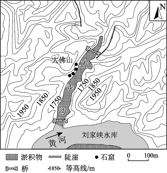 刘家峡水库地处黄河上游的甘肃永靖县境内,于1968年建成蓄水,正常年份水位可高达1735米。在其库尾的黄河岸边有著名的世界文化遗产炳灵寺石窟,石窟主要分布在大寺沟崖壁上(下图),由于泥沙淤积,大寺沟由最初的“V”形沟逐渐淤积成平地。
