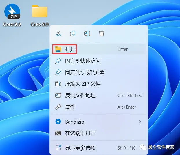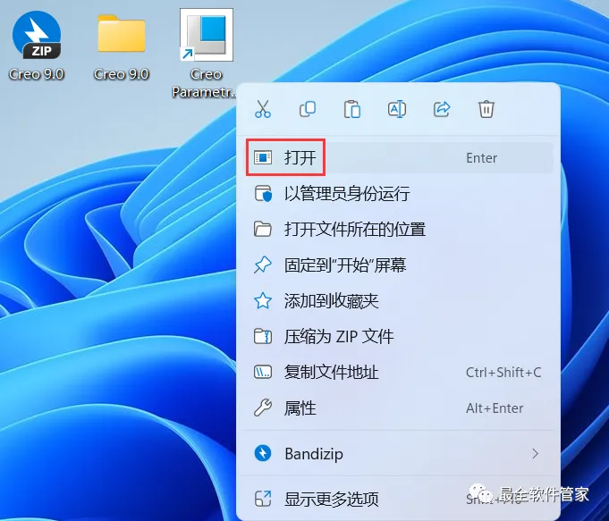 36、回到桌面,右键桌面上的【Creo 9.0软件图标】,点击【打开】