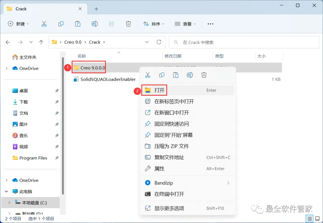27、回到Creo 9.0文件夹,找到【Crack】文件夹,右键【打开】它