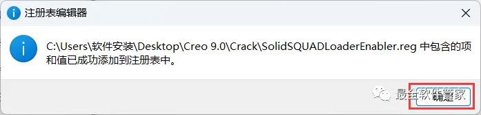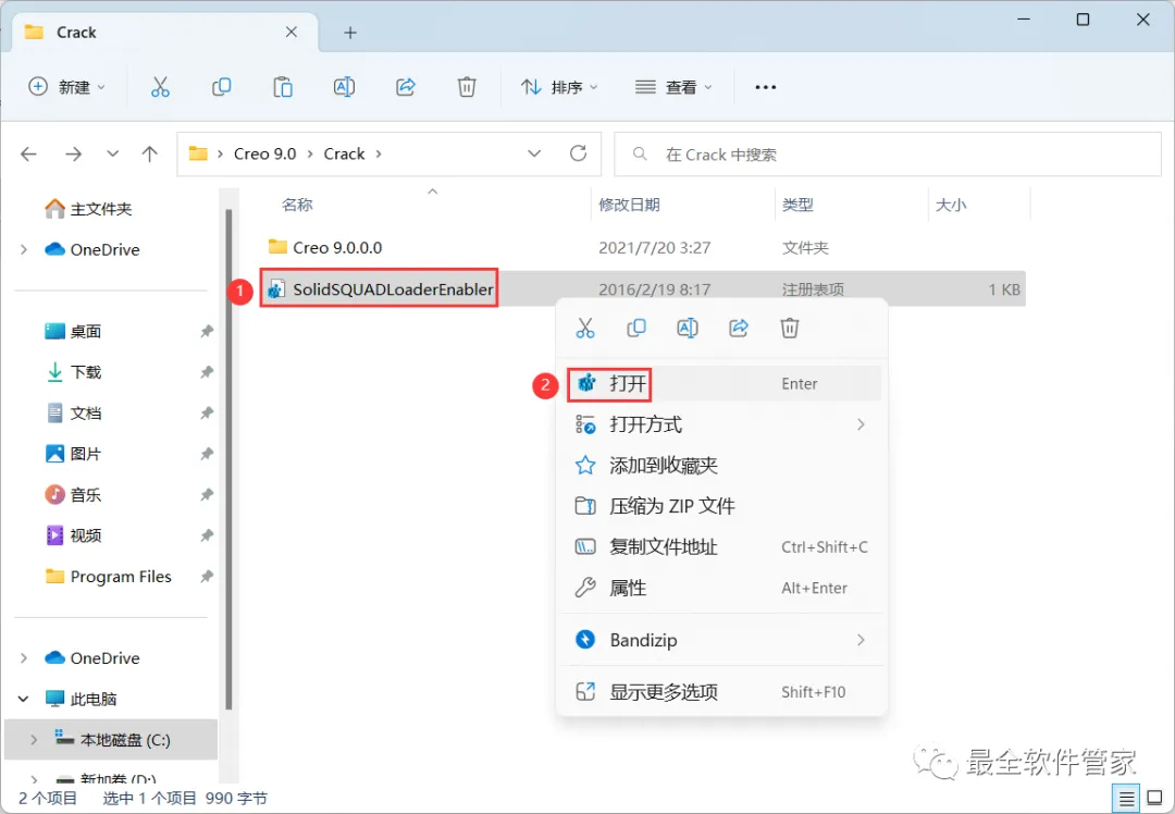 33、回到Creo 9.0文件夹下的Crack文件夹,找到【SolidSQUADLoaderEnabler】文件,右键【打开】它