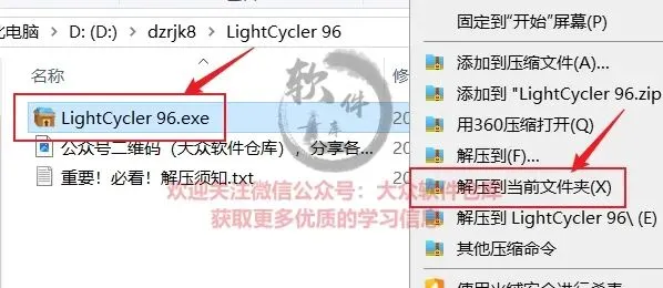 1.把资源从网盘下载到电脑上面,右键LightCycler 96.exe压缩包选择解压到当前文件夹;